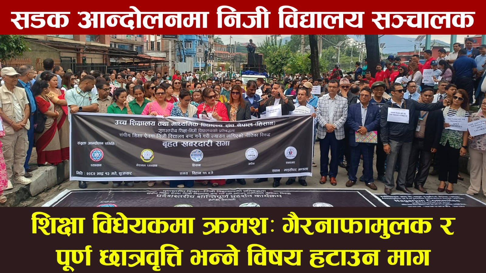 आफूले भनेजस्तो शिक्षा ऐन जारी नहुने भएपछि शिक्षक महासंघसँगै निजी विद्यालय सञ्चालकहरू समेत आफ्नो माग समेट्न दबाबपूर्ण आन्दोलनमा उत्रिएका थिए। उनीहरूले कम्पनी ऐन अनुसार दर्ता भई सञ्चालनमा रहेका विद्यालयहरूलाई ‘गैर-नाफामूलक’ बनाउँदै लगिने भन्ने प्रावधान हटाइनु पर्ने, ‘पूर्ण छात्रवृत्ति’ भन्ने शब्द हटाइनु पर्ने, विद्यालयहरूमा उत्पादन नहुने सामग्रीहरू जस्तै पोशाक, पाठ्यपुस्तक, शैक्षिक सामग्री, यातायात, खाना, खाजा उपलब्ध गराउने प्रावधान खारेज गर्नुपर्ने, छात्रवृत्ति वितरणको अधिकार सम्बन्धित विद्यालयमा रहनुपर्ने लगायतका माग अघि सारेर आन्दोलन गरेका थिए।