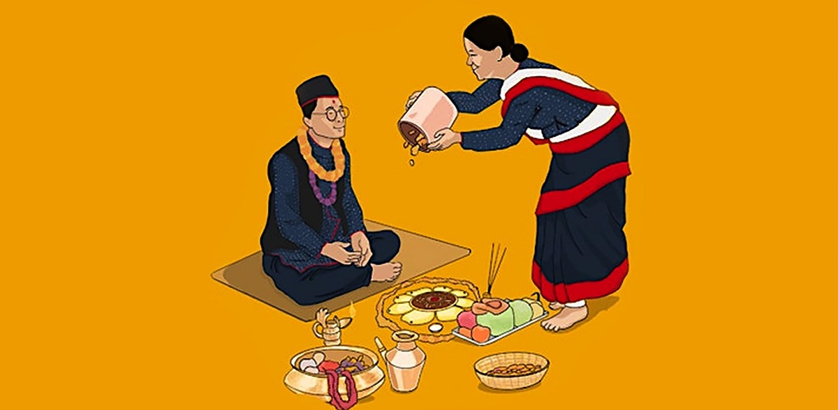 यो दिनमा परिवारकी ज्येष्ठ महिलाबाट सबै सदस्यलाई पूजा गरिन्छ। त्यसक्रममा उमेरअनुसार लहरै बस्ने गरिन्छ। यसअघि परम्पराअनुसार चामलको पीठोले मन्डला बनाउने र त्यसमा विभिन्न प्रकारका फलफूलहरु राख्ने पनि गरिन्छ। यो पूजा गर्नुपूर्व घरबाहिर पालामा दीप बाल्ने गरिन्छ। बत्ती बालेर घरभित्र मण्डप बनाइन्छ। यो पूजा प्रतिपदाको दिन राति गर्ने पूजा हो। विशेषगरी बुईंगल (घरको सबैभन्दा माथिको ठाउँ)मा यो पूजा गरिन्छ।