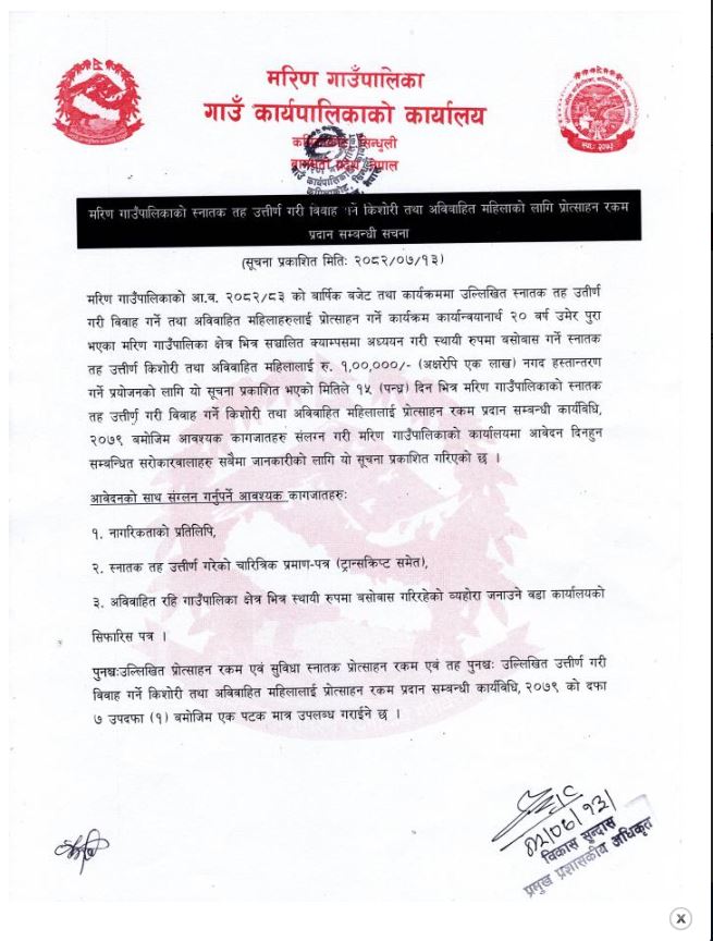काठमाडाैँ - सिन्धुलीको मरिण गाउँपालिकाले यस वर्ष स्नातक तह उत्तीर्ण गरी विवाह गर्ने किशोरी तथा अविवाहित महिलालाई एक लाख रुपैँया प्रोत्साहन भत्ता दिने भएको छ। पालिकाले बाल विवाह न्यूनीकरणका लागि २० वर्ष पूरा गरी स्नातक तह उत्तीर्ण गरेर विवाह गर्ने किशोरी तथा विवाह नगरी बसेका महिलालाई उक्त भत्ता उपलब्ध गराउन लागेको हो।
