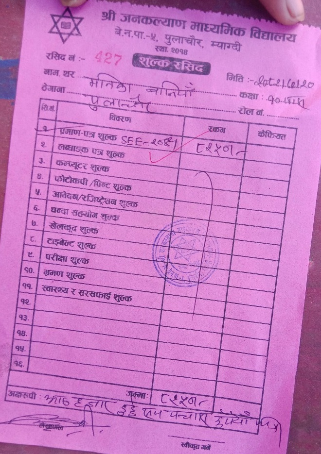काठमाडाैँ - म्याग्दीको बेनी नगरपालिका-५ पुलाचौरस्थित जनकल्याण माध्यमिक विद्यालयले एसइई प्रमाणपत्र लिने क्रममा विद्यार्थीबाट आठ हजार रुपैयाँभन्दा बढि असुली गरेको खुलासा भएको छ। सरकारी विद्यालयबाटै चर्को शुल्क असुली भएपछि अभिभावक र स्थानीयवासी आक्रोशित बनेका छन्।