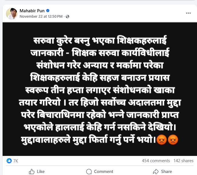 शिक्षक महासंघसँग गत १५ असारभित्र शिक्षा ऐन संसद्बाट पारित गर्ने सहमति भएको थियो। तर ६ भदौमा प्रतिनिधिसभामा विधेयक पेस गरेसँगै भदौको अन्तिम सातातिर विधेयक पारित गर्ने तयारी थियो। तर जेनजी आन्दोलनका कारण २७ भदौमा संसद् नै विघटन भएपछि शिक्षकको सेवा र कानुन गुमेको थियो। महासंघको टोलीले मन्त्री पुनलाई भेटेर सरुवा निर्देशिका खारेज हुनुपर्ने माग पनि राखेको थियाे। तर यसमा पनि सरकारले तत्काल केही गर्न नसक्ने जवाफ दिएको छ।