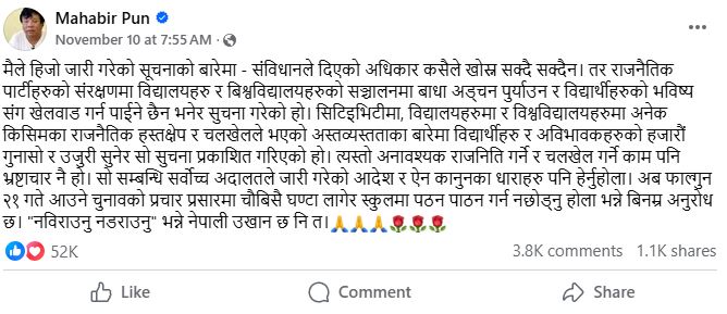 महासंघसहित संघसंगठनको आलोचनापछि मन्त्री पुनले संविधानले दिएको अधिकार नखोसिने तर राजनीतिक पार्टीहरूको संरक्षणमा विद्यालय र विश्वविद्यालयहरूको सञ्चालनमा बाधा पु¥याउने, विद्यार्थीको भविष्यसँग खेलवाड गर्ने काम सह्य नहुने पुन जवाफ दिएका थिए।