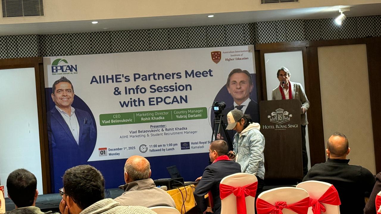 काठमाडाैँ- अष्ट्रलियन ईन्टरनेशनल ईन्स्टिचिउट अफ हायर एजुकेशन (एआइआइएचई) र शैक्षिक परामर्श व्यवसायी संघ (ईप्क्यान) बिचकाे 'एआइआइएचई पार्टनर्स मिट एण्ड ईन्फो सेसन' सम्पन्न भएको छ। सोमबार (१ डिसेम्बर) मा काठमाडौँ कमलादीस्थित होटल रोयल सिँगीमा उक्त ईन्फो सेसन सम्पन्न भएको हो।