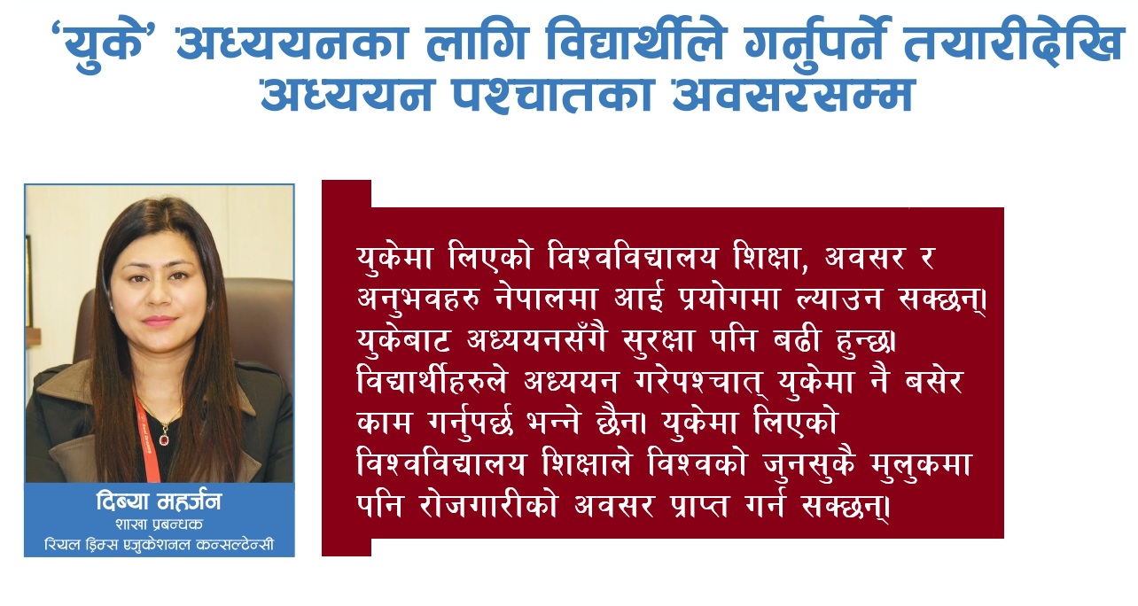 काठमाडाैँ- युकेको शैक्षिक गुणस्तर र अध्ययन पश्चातको अवसरको हिसाबले पछिल्लो समय नेपाली विद्यार्थीको रोजाइको शैक्षिक गन्तव्य बनेको छ। युकेमा शैक्षिक गुणस्तर मात्र नभई, अध्ययन पश्चात रोजगारीको अवसर, परिवर्तनशिल तथा आधुनिक शिक्षा र अंग्रेजी भाषा बोल्ने मुलुक भएकाले नेपाली विद्यार्थीको रोजाइमा पर्ने गरेको हो।