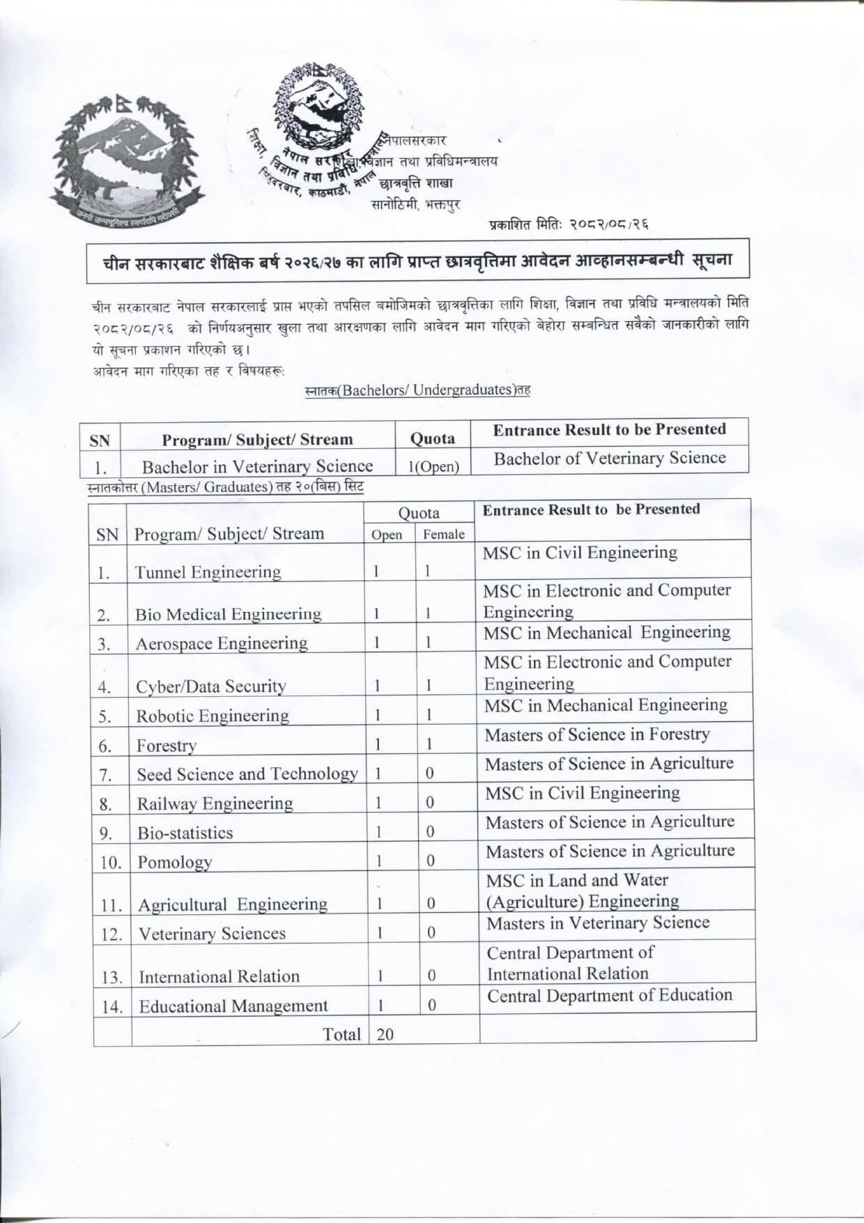जसअन्तर्गत स्नातक तहमा भेटेरिनरी साइन्समा १ जनाकाे काेटा निर्धारण गरिएकाे छ। यस्तै स्नातकाेतर र विद्यावारिधि (पीएचडी) तहका लागि टनेल इन्जिनियरिङ,बायोमेडिकल इन्जिनियरिङ,एयरोस्पेस इन्जिनियरिङ,साइबर/डाटा सेक्युरिटी,रोबोटिक इन्जिनियरिङ र फरेस्टि साइन्स विषयतर्फ खुला र महिला गरी प्रत्येक विषयमा २ जनाकाे लागि छात्रवृत्ति काेटा निर्धारण गरिएकाे छ। यस्तै सिड साइन्स एण्ड टेक्नाेलाेजी, रेल्वे इन्जिनियरिङ, जैव-सांख्यिकी, पोमोलोजी, एग्रीकल्चर इन्जिनियरिङ, भेटेरिनरी साइन्स, इन्टरनेशनल रिलेशन र एजुकेशन म्यानेजमेन्ट विषयतर्फ खुलामा प्रत्येक विषयमा १ जना गरी जम्मा २० जनाकाे लागि छात्रवृत्ति काेटा निर्धारण गरी फारम खुलाएकाे हाे।