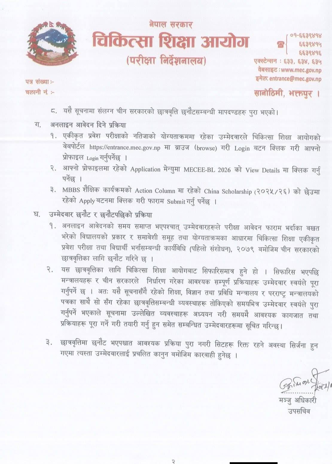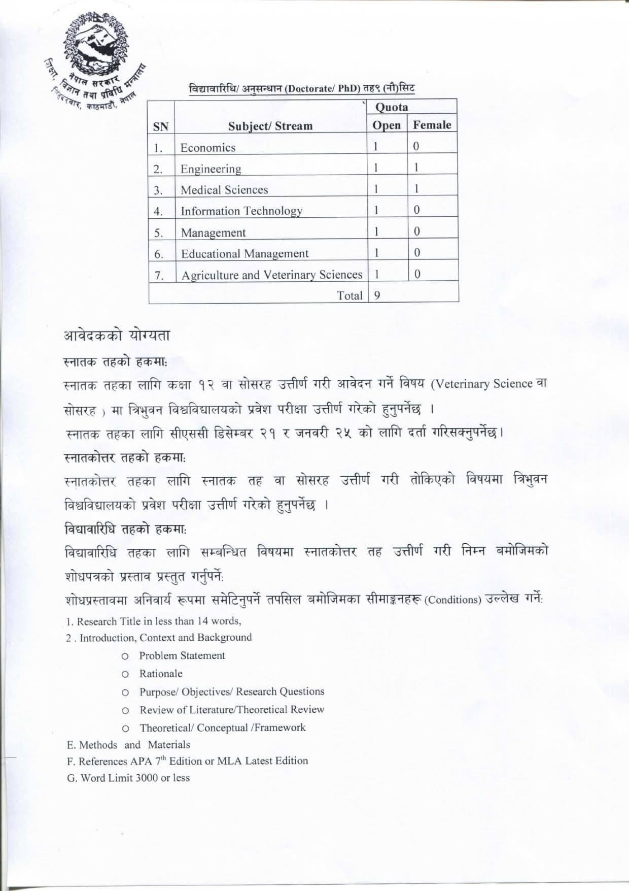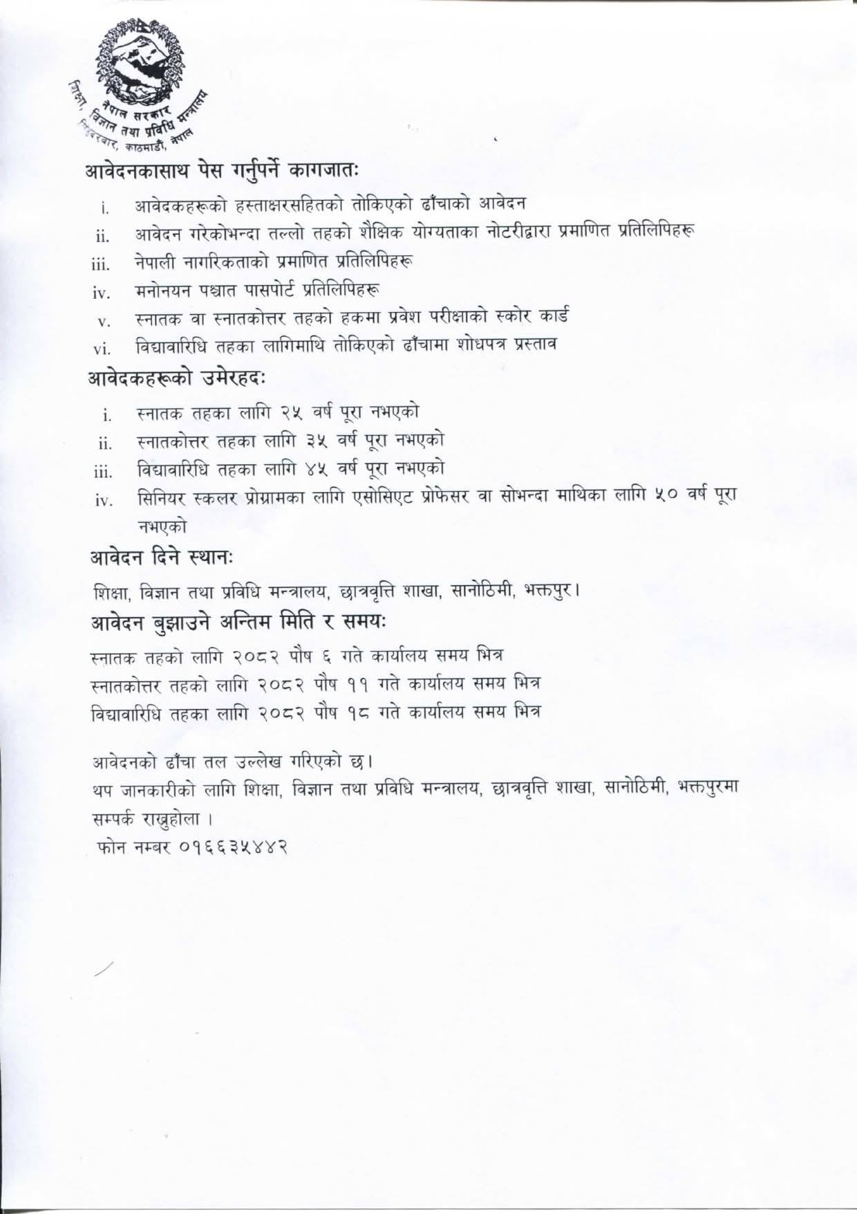 मन्त्रालयकाे सूचना अनुसार स्नातक, स्नातकाेतर र विद्यावारिधि (पीएचडी) तहका लागि आवेदन आह्वान गरिएको हाे।