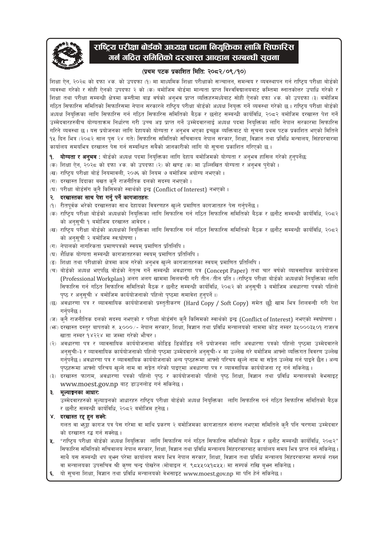 काठमाडौँ- सिफारिस समितिले राष्ट्रिय परीक्षा बोर्डको अध्यक्ष पदका लागि दरखास्त आह्वान गरेको छ। शिक्षा, विज्ञान तथा प्रविधि मन्त्रालयद्वारा बिहीबार सूचना जारी गर्दै इच्छुक र योग्य व्यक्तिले पहिलोपटक प्रकाशित भएको सूचनाकाे मितिले १५ दिनभित्र अर्थात् २०८२ साल पुस २४ गतेभित्र दरखास्त दिन आह्वान गरेको हाे।