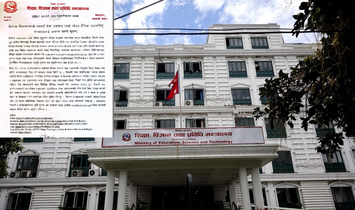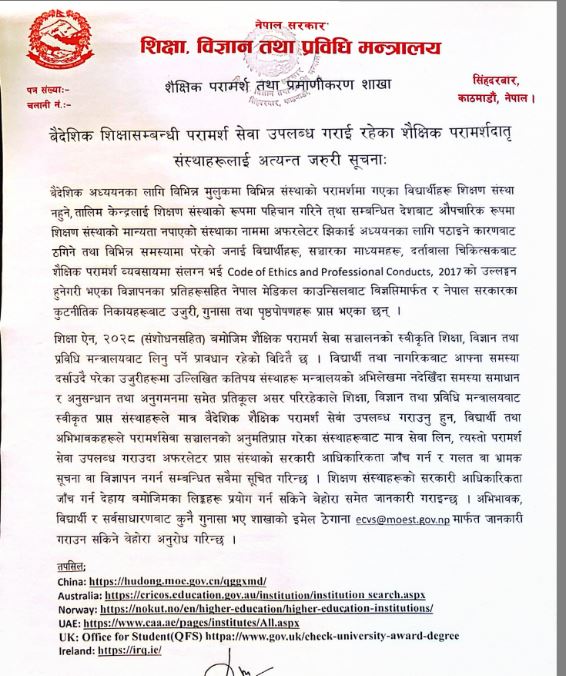 काठमाडौँ - शिक्षा, विज्ञान तथा प्रविधि मन्त्रालयले विदेशमा अध्ययन गर्न चाहने विद्यार्थीलाई दर्ता नभएका तथा अवैध शैक्षिक परामर्श संस्थाबाट सेवा नलिन आग्रह गरेको छ। मन्त्रालय अन्तर्गतको शैक्षिक परामर्श तथा प्रमाणीकरण शाखाले सूचना जारी गर्दै विदेशी अध्ययनसम्बन्धी परामर्श सेवा प्रदान गर्ने संस्थाहरूले अनिवार्य रूपमा मन्त्रालयबाट अनुमति लिनुपर्ने स्पष्ट पारेको हो।