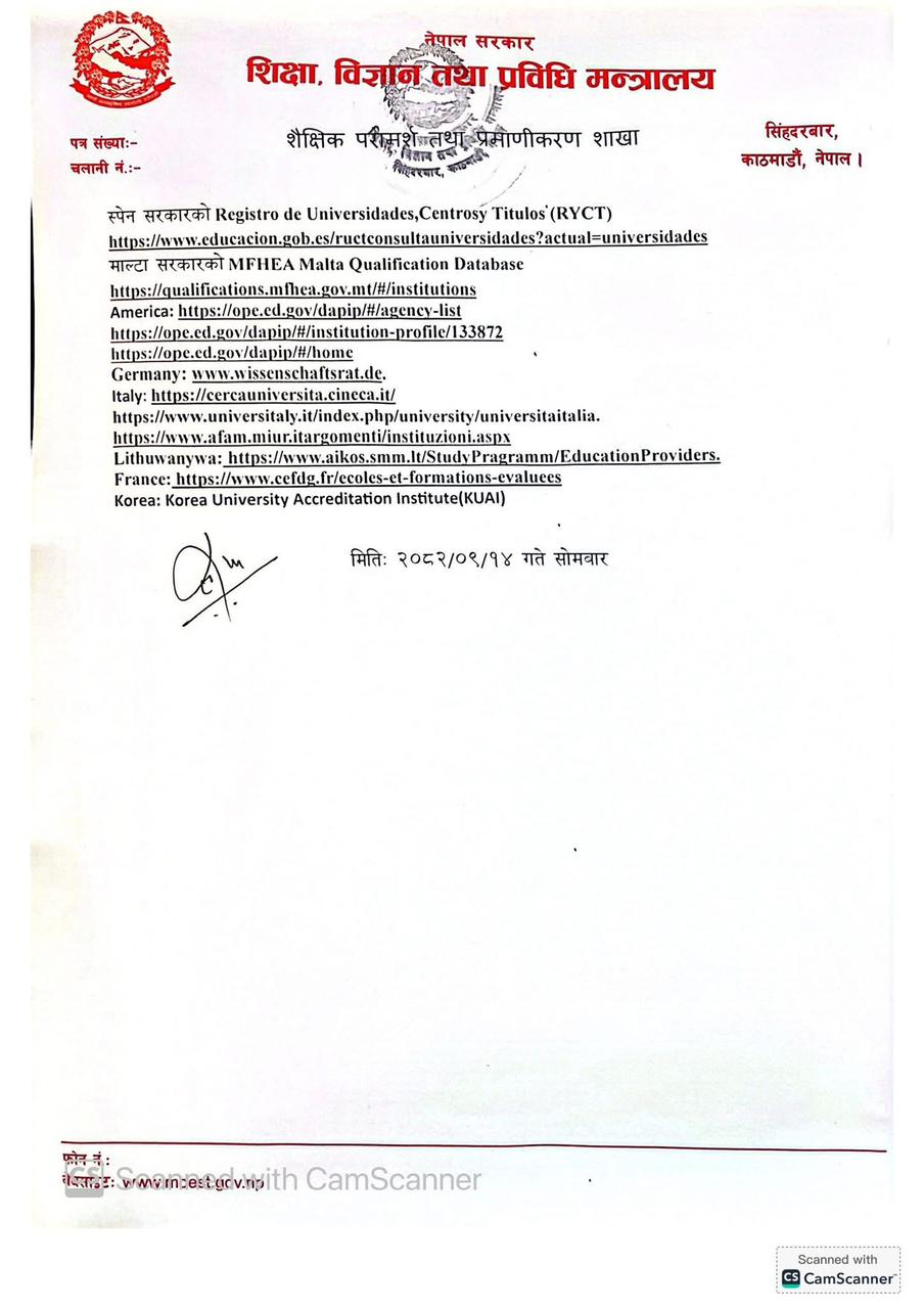 मन्त्रालयले चीन, अष्ट्रेलिया, नर्वे, अमेरिका, बेलायत र आयरल्याण्डलगायत मुलुकका विश्वविद्यालय तथा शैक्षिक संस्थाको आधिकारिक मान्यता जाँच गर्न सम्बन्धित देशका सरकारी वेबसाइट प्रयोग गर्नसमेत सुझाव दिएको छ। यसले नक्कली विश्वविद्यालय, फर्जी कलेज तथा अवैध शैक्षिक प्रमाणपत्रबाट जोगिन सहयोग पुग्ने विश्वास मन्त्रालयले व्यक्त गरेको छ।