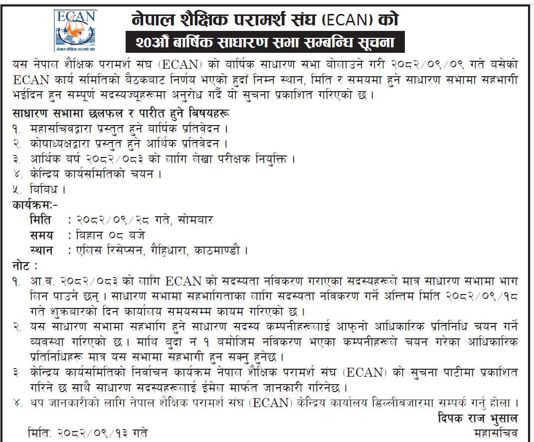काठमाडौँ - नेपाल शैक्षिक परामर्श संघ (ECAN) को २०औँ वार्षिक साधारण सभा आगामी २०८२ साल पुस २८ गते सोमबार काठमाडौँमा आयोजना हुने भएको छ। विदेश अध्ययनमा जान चाहने विद्यार्थीलाइ शैक्षिक परामर्श सेवा प्रदान गर्दै आएका परामर्श दातृहरूकाे छातासँगठन इक्यानको पुस ९ गते बसेकाे कार्यसमितिको बैठकबाट निर्णय भई साधारण सभा बोलाइएको हो।