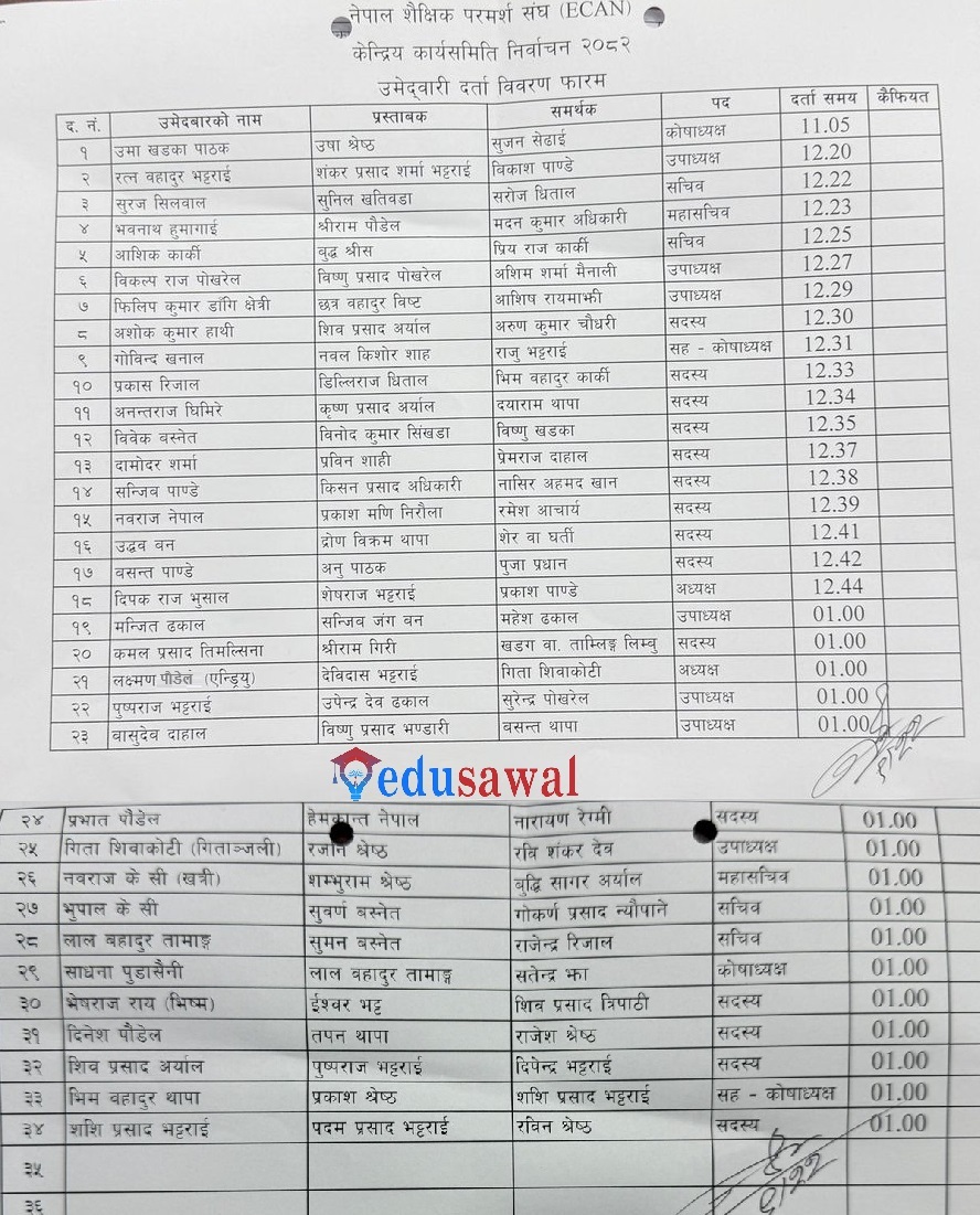 ईडीयू सवाल डटकमलाई प्राप्त सूचनाका आधारमा इक्यानमा मुख्य गरेर नेपाली कांग्रेस निकट व्यवसायीहरूको तर्फबाट साझा अध्यक्षको उम्मेद्वारको रूपमा पौडेल र नेपाली कम्युनिष्ट पार्टी निकट व्यवसायीहरुको साझा उम्मेद्वारको रुपमा भुषाल देखिएका छन्। त्यस्तै नेकपा एमाले निकट व्यवसायीहरूको संगठन प्रगतिशिल शैक्षिक परामर्श व्यवसायी संघ (पिक्यान)ले अध्यक्षमा उम्मेद्वारी नदिएपनि भुषाल प्यानलबाट उपाध्यक्ष, सचिव र ३ जना सदस्य सहित उम्मेद्वारी दिएकाे जनाएकाे छ। पिक्यानका अध्यक्ष बासु नेपालले अध्यक्षबाहेक अन्य पदमा पिक्यानले सहकार्य गर्दै भुषाल प्यानलबाट उम्मेद्वारी दिएकाे बताए।