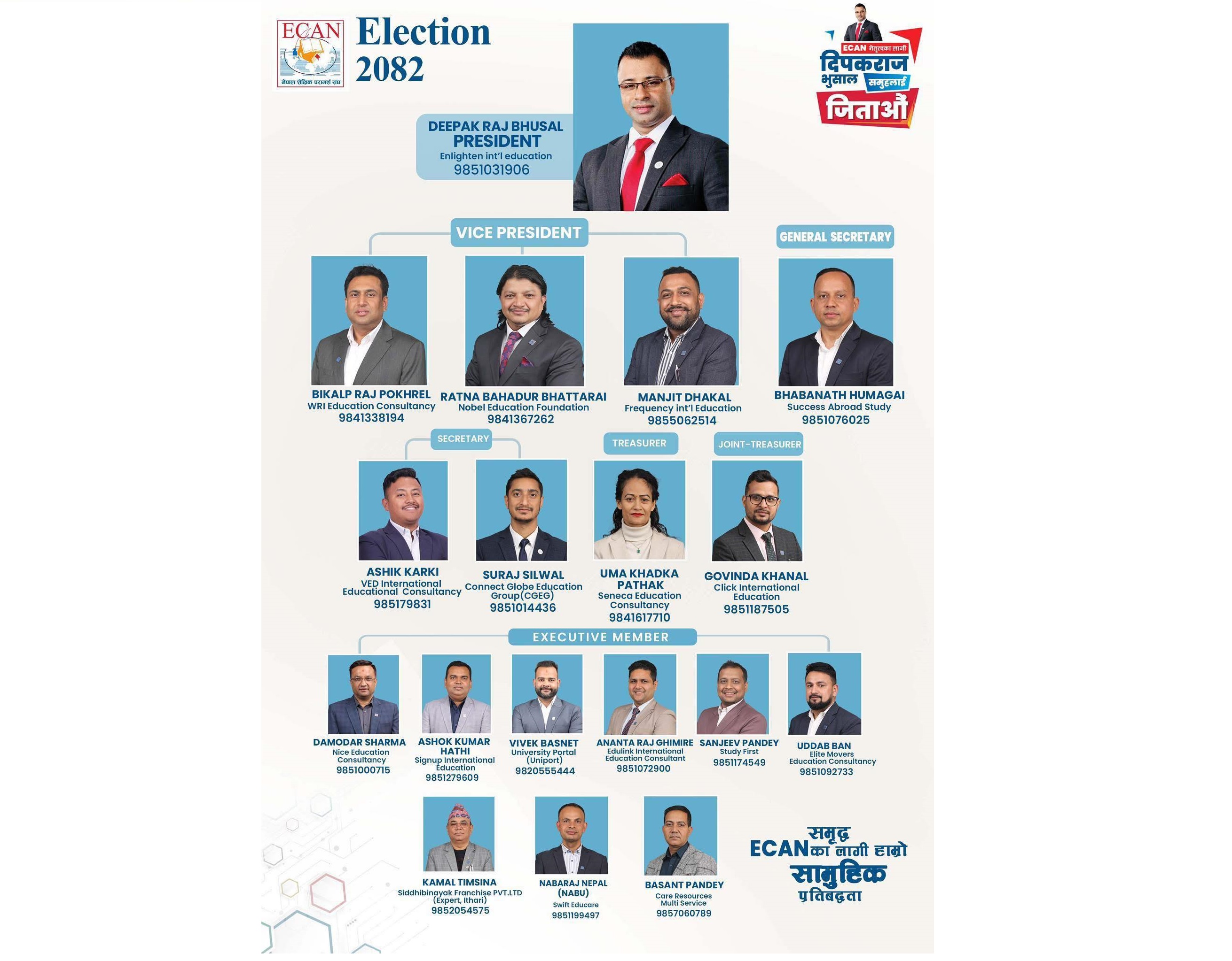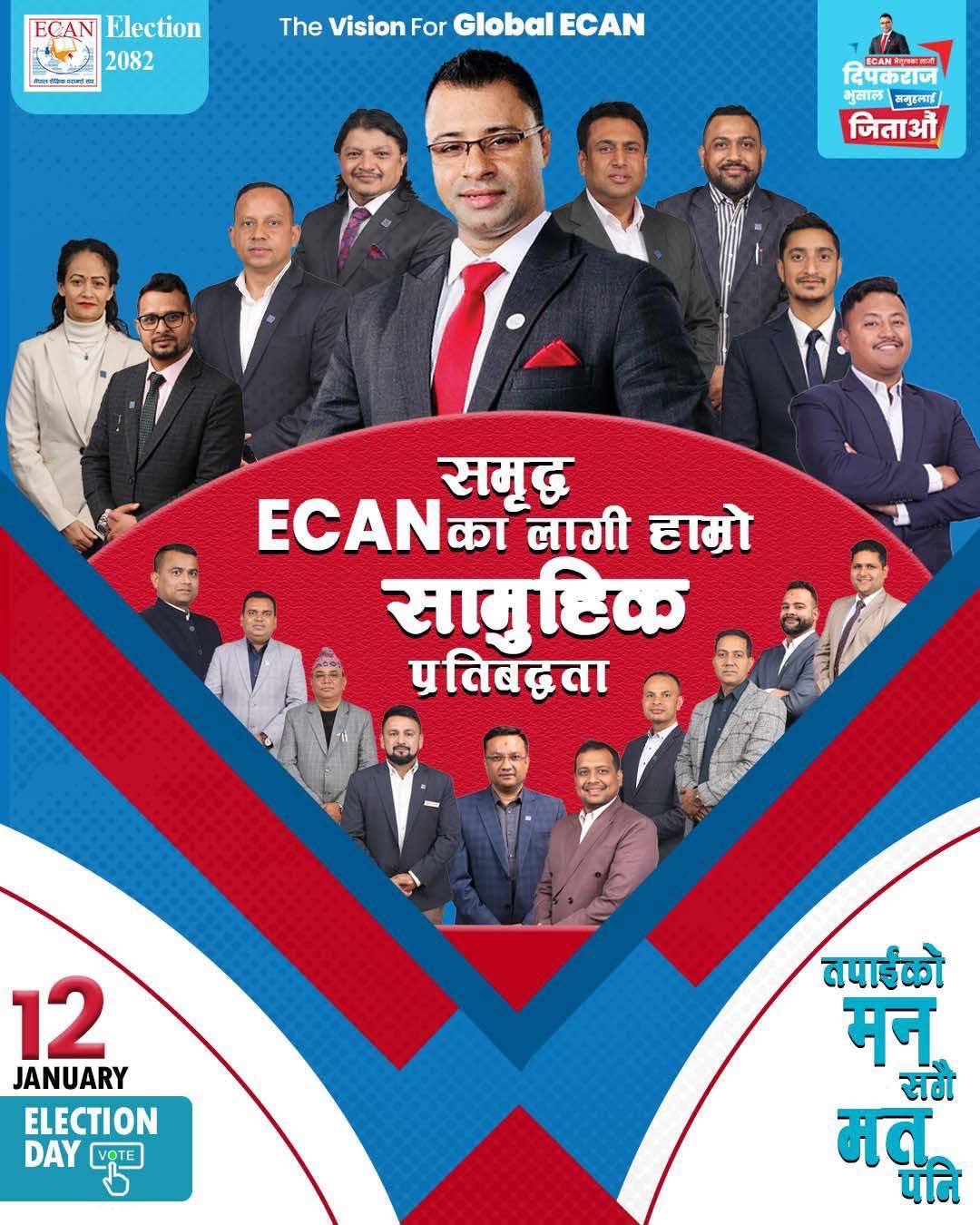 म आगामी दुई वर्षका लागि ECAN को लागि पूर्णकालीन समर्पित रहनेछु। यो अवधिमा मेरो समय, ऊर्जा र पेशागत क्षमताको सम्पूर्ण केन्द्रित उपयोग ECAN का ७०० सदस्य र संस्थाको विकास, साख, र अग्रगामी योजनाहरूको लागि गरिनेछ। मेरो प्रतिबद्धता स्पष्ट छ: part-time होइन, पूर्ण-समर्पित नेतृत्व, जसले संस्थालाई द्रुत निर्णय, स्थायी परिणाम र सबै सदस्यहरूको हितमा अग्रसर बनाउनेछ।