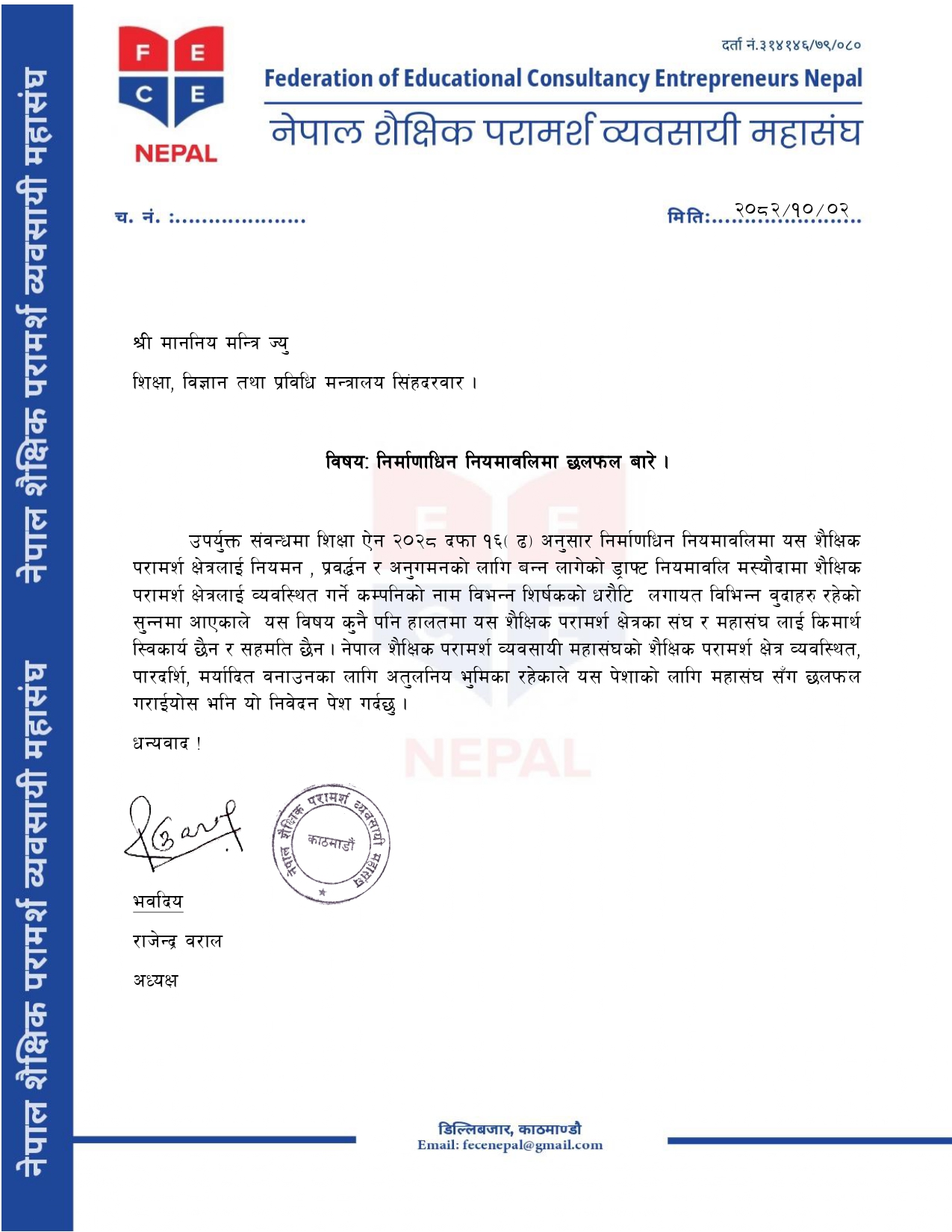 पत्रमा भनिएको छ, हालसम्म उक्त नियमावली निर्माण प्रक्रियामा शैक्षिक परामर्श क्षेत्रका संघ तथा महासंघसँग कुनै औपचारिक संवाद, सहभागिता वा सहमति नलिइएको विषयप्रति महासंघको गम्भीर चासो रहेको छ।
