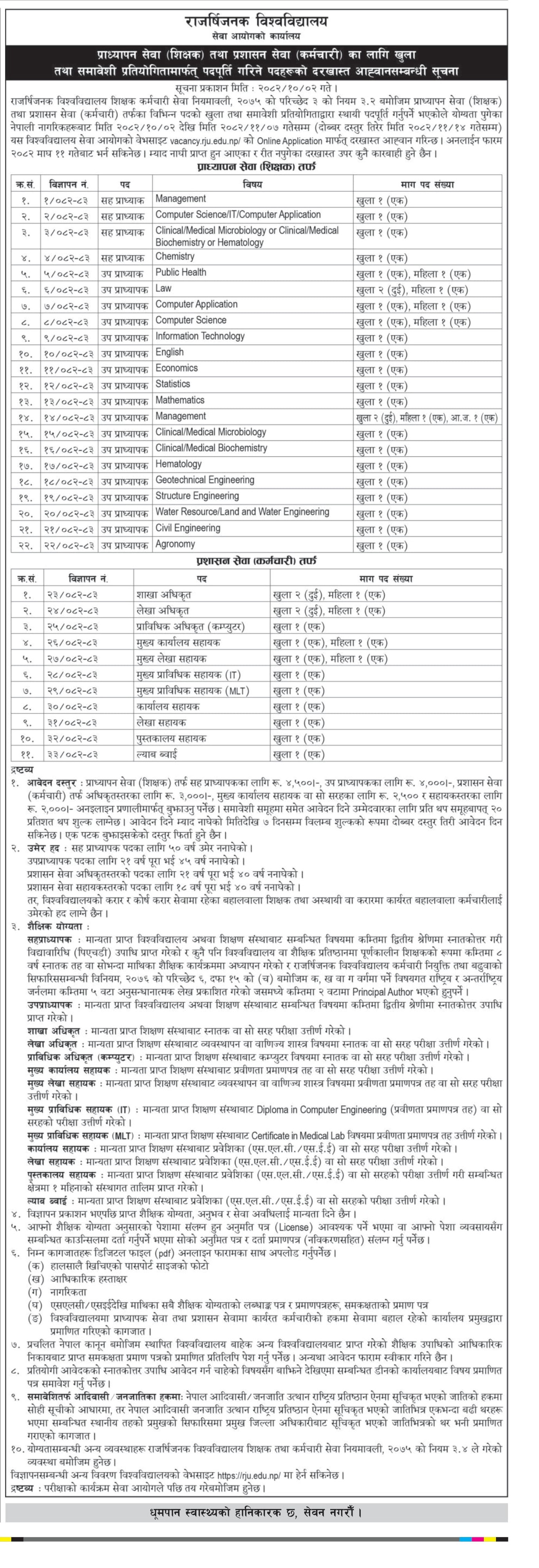 सूचनाअनुसार व्यवस्थापन, कम्प्युटर साइन्स, क्लिनिकल, कानुन, जनस्वास्थ्य, अंग्रेजी, अर्थशास्त्र, तथ्यांकशास्त्र, सिभिल इन्जिनियरिङलगायत विषयमा सहप्राध्यापक तथा उपप्राध्यापक आवश्यक रहेको विश्वविद्यालयले जनाएको छ।
