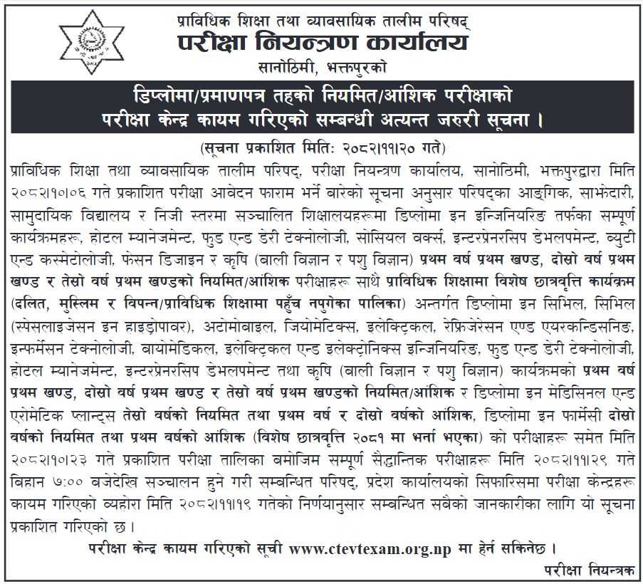 परीक्षा केन्द्रहरूको विस्तृत सूची CTEVT Examination Control Office को आधिकारिक वेबसाइट www.ctevtexam.org.np मा हेर्न सकिने जनाइएको छ।