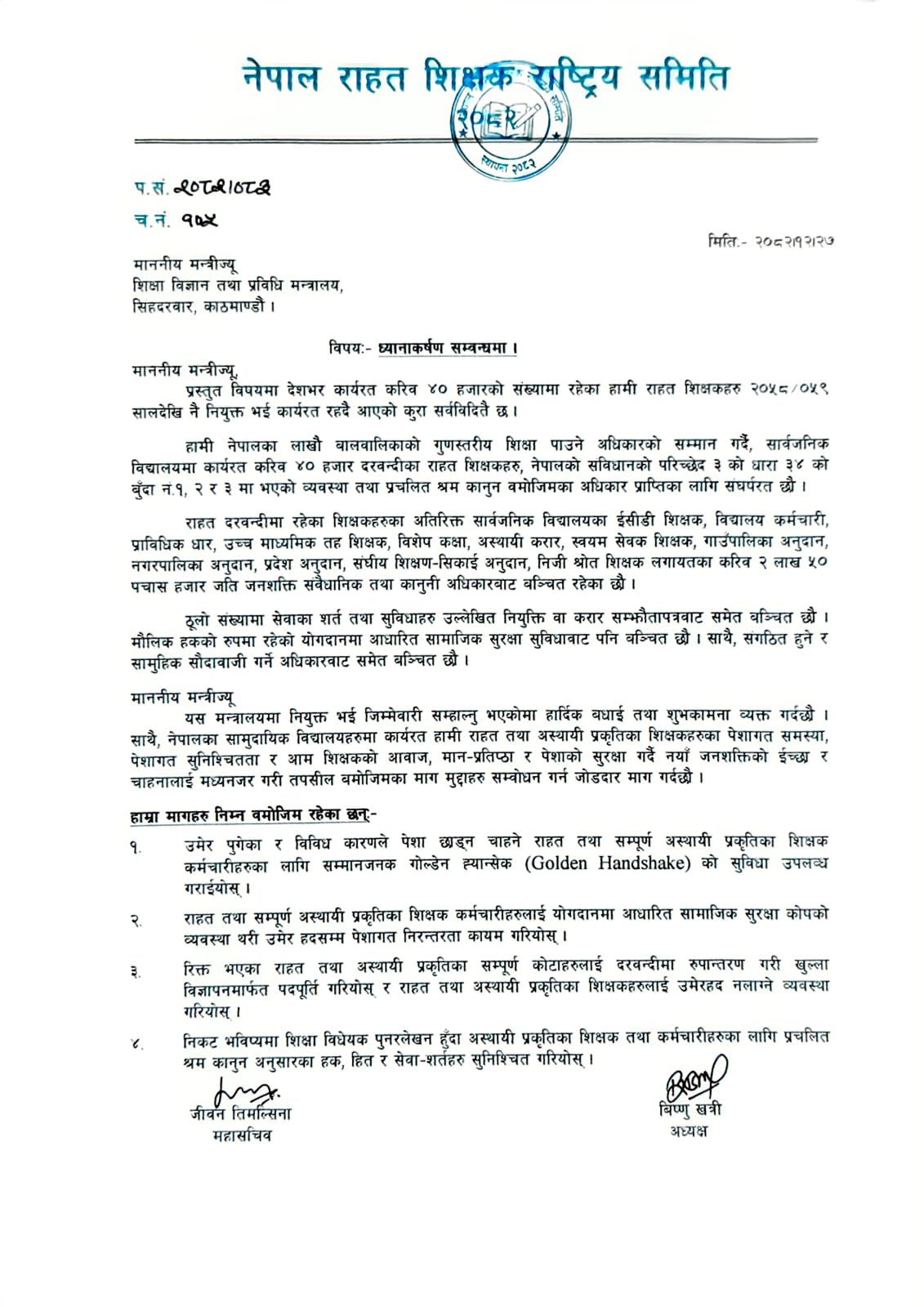 समितिले शिक्षामन्त्रीलाई सम्बोधन गर्दै बुझाएको पत्रमा देशभर करिब ४० हजारको संख्यामा रहेका राहत शिक्षकहरू २०६३ सालदेखि निरन्तर सेवा गर्दै आएको उल्लेख गरेको छ। पत्रमा विगतमा विभिन्न चरणमा आन्दोलन, वार्ता तथा सहमतिहरू भए पनि शिक्षकहरूको पेशागत सुरक्षा र स्थायित्वको विषय अझै समाधान हुन नसकेको गुनासो गरिएको छ। विशेषगरी सामुदायिक विद्यालयहरूमा कार्यरत राहत, अस्थायी, करार तथा प्राविधिक धारका शिक्षकहरूले भोग्दै आएको असुरक्षा, न्यून सुविधा र अनिश्चित भविष्यप्रति सरकारको ध्यानाकर्षण गराइएको छ।