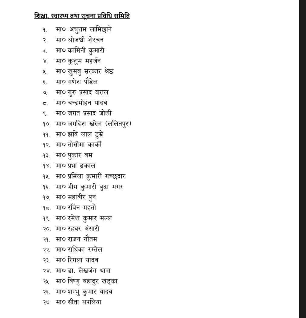 प्रतिनिधि सभा शिक्षा, स्वास्थ्य तथा सूचना प्रविधि समितिमा २७ जना सांसद, को-को भए सदस्य ? (नामावलीसहित)
