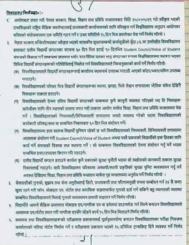 बैठकले विश्वविद्यालयभित्र विद्यार्थी संगठनलाई कार्यालयका लागि दिइँदै आएका कोठा, भवन वा जमिन उपलब्ध नगराउने, तथा ब्यानर, भित्तेलेखनजस्ता सबै भौतिक संकेत तुरुन्त हटाउने निर्णय पनि गरेको छ।यदि विश्वविद्यालयको ऐन वा नियमावलीमा दलीय विद्यार्थी संगठनसम्बन्धी व्यवस्था रहेको भए त्यसलाई खारेज वा संशोधन गर्नुपर्ने निर्णय गरिएको छ।