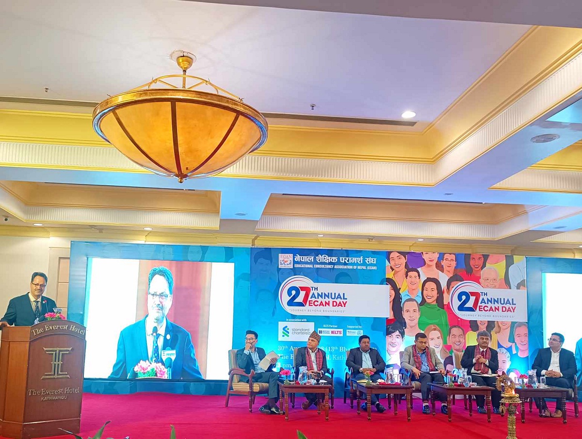 काठमाडौँ- शिक्षा क्षेत्रका सरोकारवालाले नेपाललाई शैक्षिक हबको रुपमा विकास गर्न जोड दिएका छन्। नेपाल शैक्षिक परामर्श संघ (इक्यान) को २७औँ वार्षिकोत्सवको अवसरमा राजधानीको एभरेष्ट होटलमा आयोजित कार्यक्रममा वक्ताहरूले नेपाललाई एजुकेशन हबको रुपमा विकास गर्नुपर्नेमा जोड दिएका हुन्।